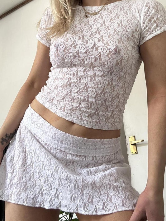 Lace Round Neck Short Sleeve Top and Skirt Set